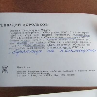 Открытка, фотография Гарин; Крамаров; Коренев; Корольков 1978; артисты СССР УРФ т. 100 тыс набор