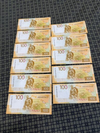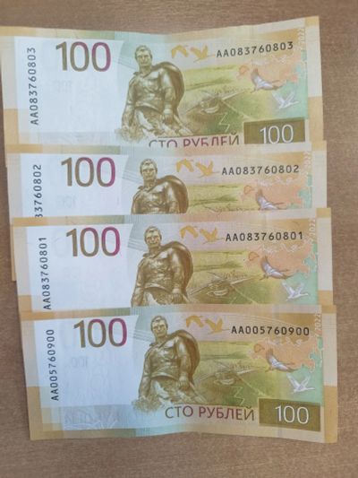 Банкнота 100 рублей сто РФ-Россия бона 2022 АА номера по порядку пресс UNC набор 2 шт Цена+номинал