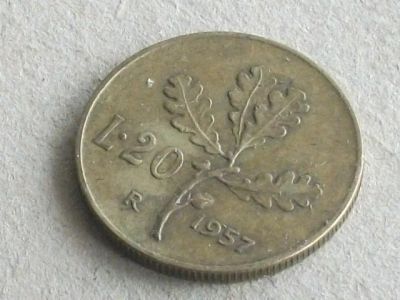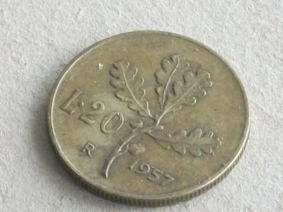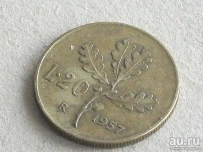 Монета 20 лир Италия 1957 Флора дуб желудь портрет