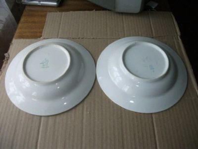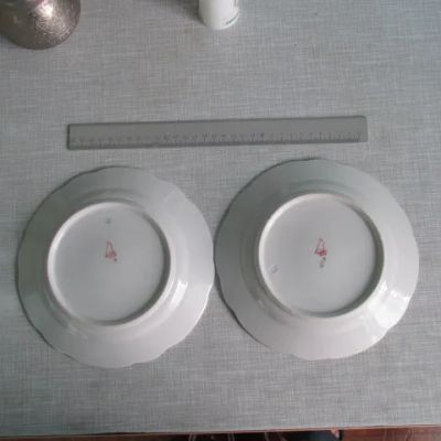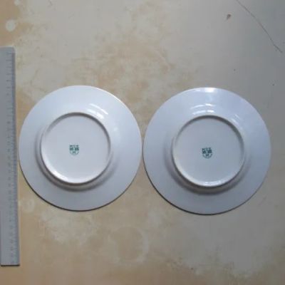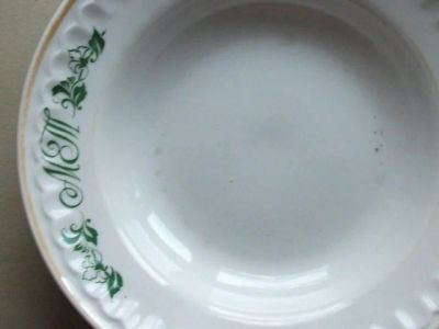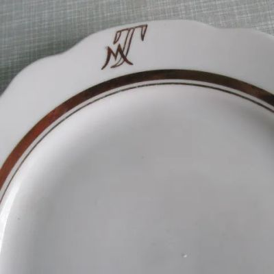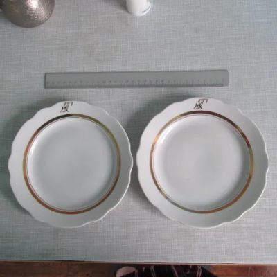 Тарелка вензель МТ низкая D-20 см клеймо Дулево 1968 г. фарфор, обводка золотом СССР набор 2 шт. Б/у