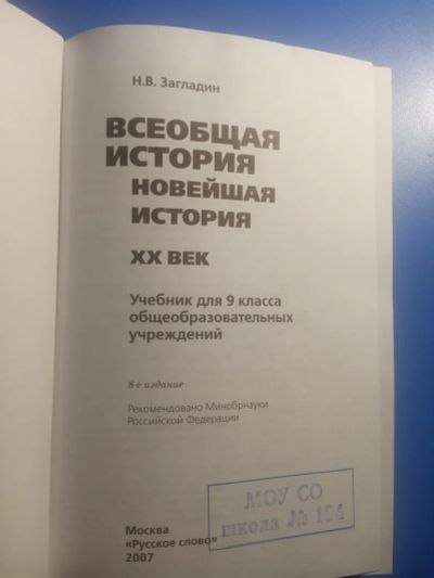 📘 Н. Загладин. Новейшая история зарубежных стран. XX век. Учебник для 9 класса основной школы. ISBN 5-94853-07-4 5-94853-214-3 / школьные учебники по истории 9 класс школьный книга книги книжка книжки /
